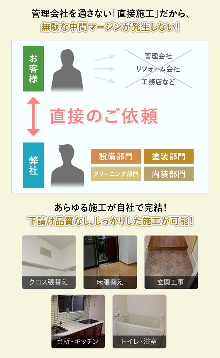 マンション・アパート・店舗に関する工事すべてが「自社」で完結する体制が整っているから、不動産屋や管理会社などに払っていた「中間マージン」のようなものは発生しません!当然やり取りをする窓口もひとつでOK!施工箇所が多く、スピードが求められる原状回復工事もオーナー様側での面倒なスケジュール調整などは一切なし!我々にお任せいただければご希望のスケジュールと工程で作業を進めます。